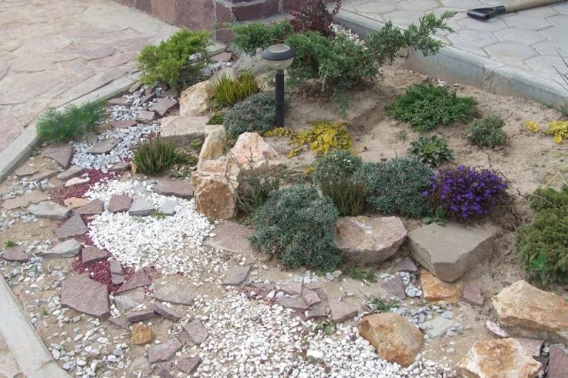 - Заготовьте необходимые материалы: лопату, совки, лейку, песок, мелкий керамзит, рыхлый грунт и, конечно, альпийские растения в контейнерах.